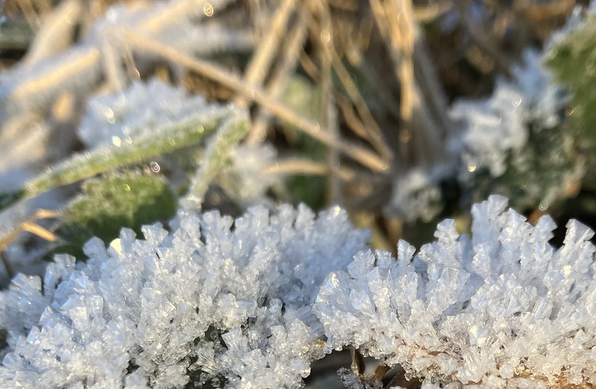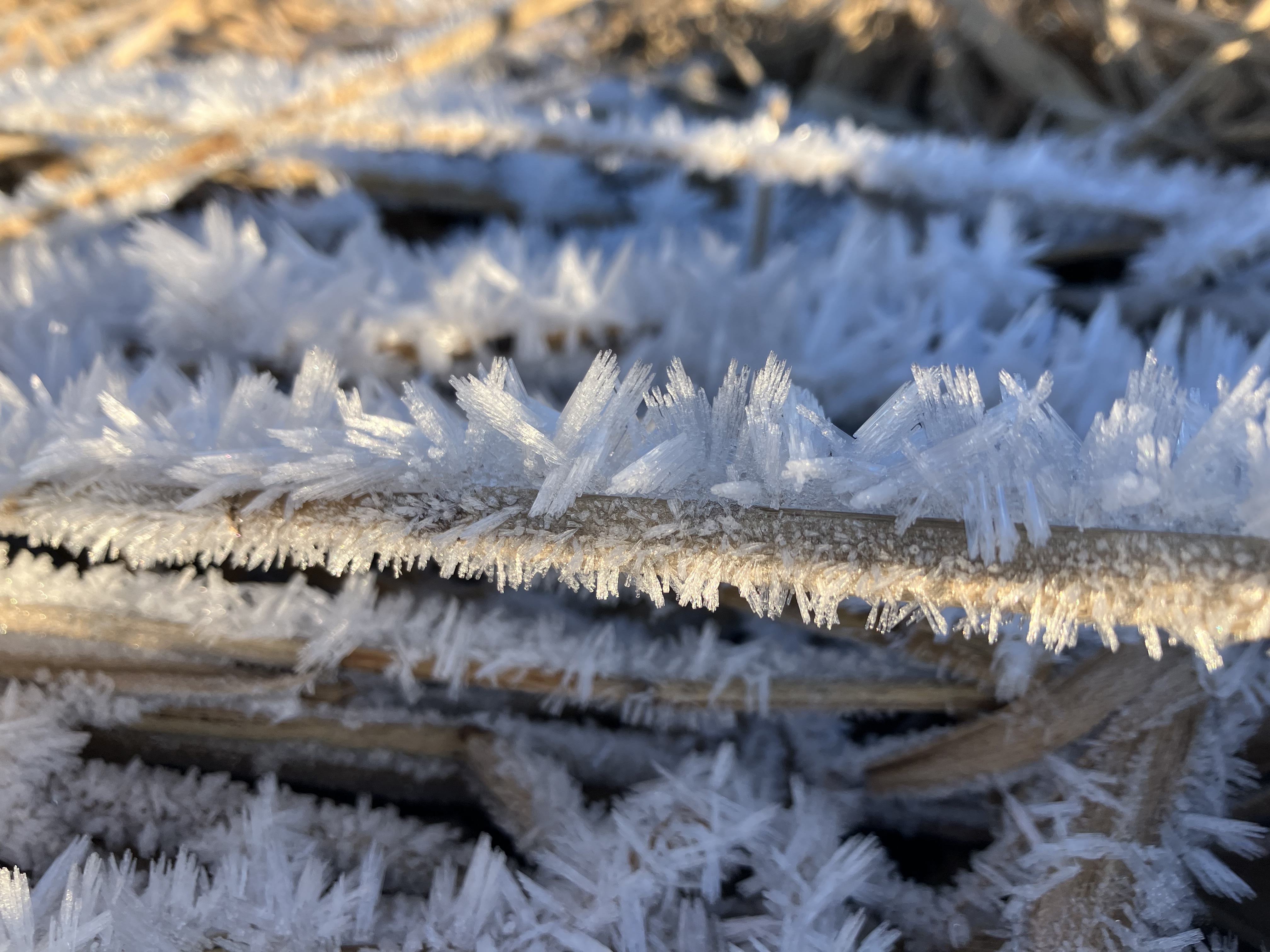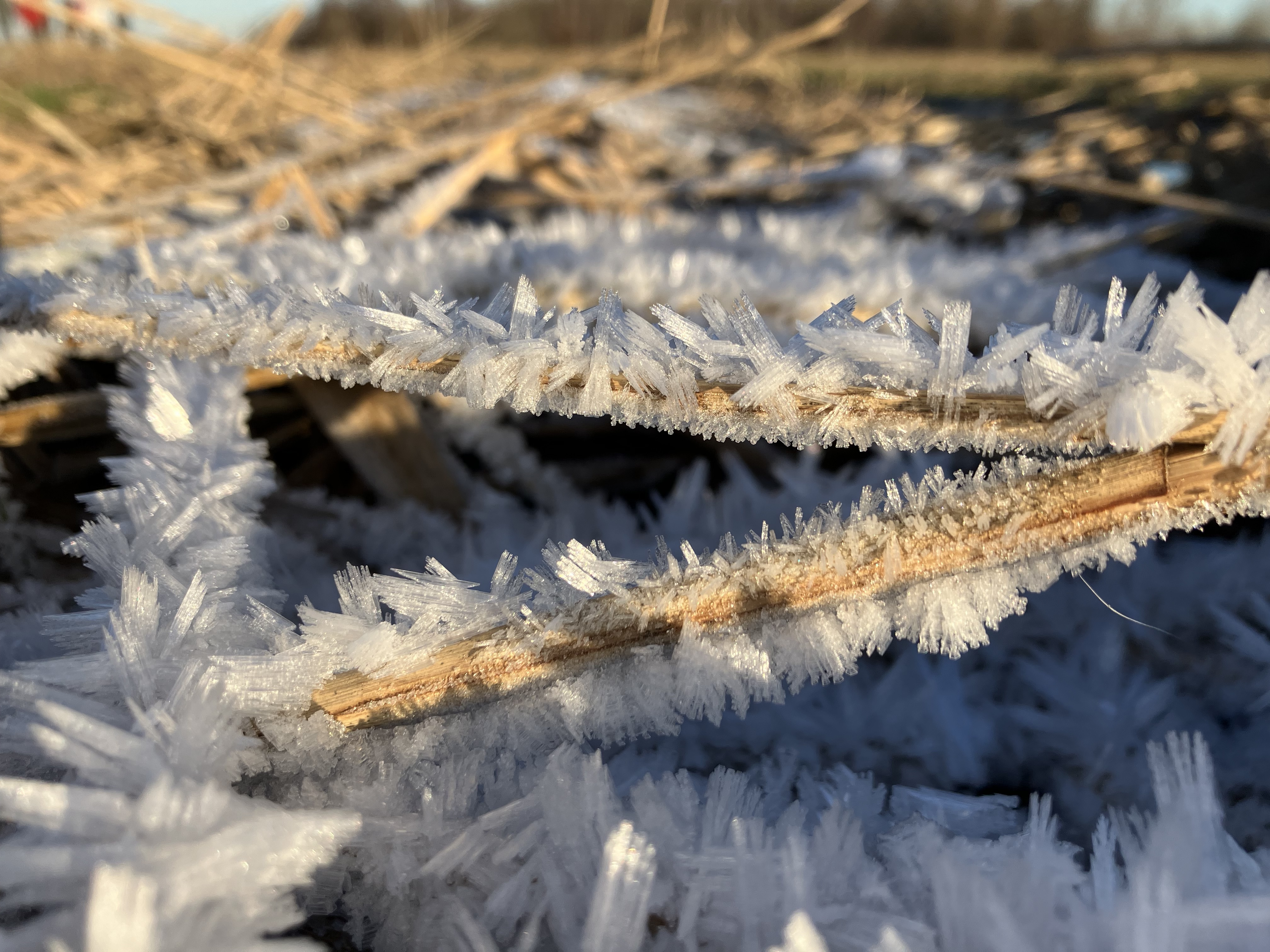 | | | | | Ruige rijp De Gezond Natuur Wandelaars genoten van een frisse ijskou en het met ruige rijp beklede gras. Dat ontstaat uit aanvriezende mist, gevormd door onderkoelde waterdruppels. | | | Voorwaarden hierbij zijn hoge luchtvochtigheid en een luchttemperatuur lager van -8 °C. Wind bevordert de aangroei. Tegen de windrichting in ontstaan naaldvormige ijskristallen. Klik op de foto’s om ze te vergroten. | | | Naast rijp en ijs schitterden tijdens die wandeling de reeds bloeiende hazelaarkatjes in het zonlicht.